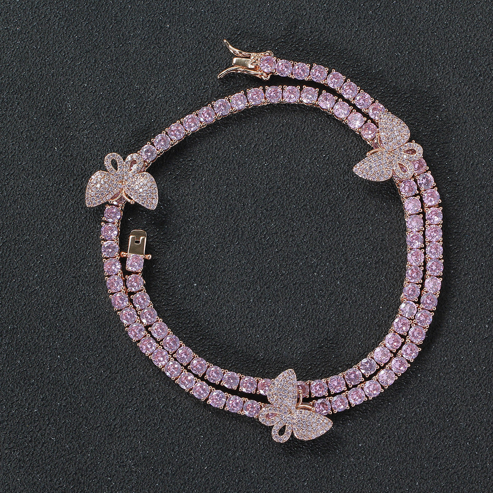 4mm tennis link with fully iced 3 butterflies short necklace choker - Rose Gold/Pink