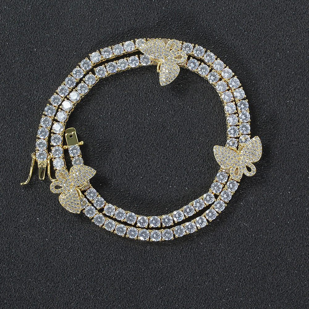 4mm tennis link with fully iced 3 butterflies short necklace choker - Yellow Gold