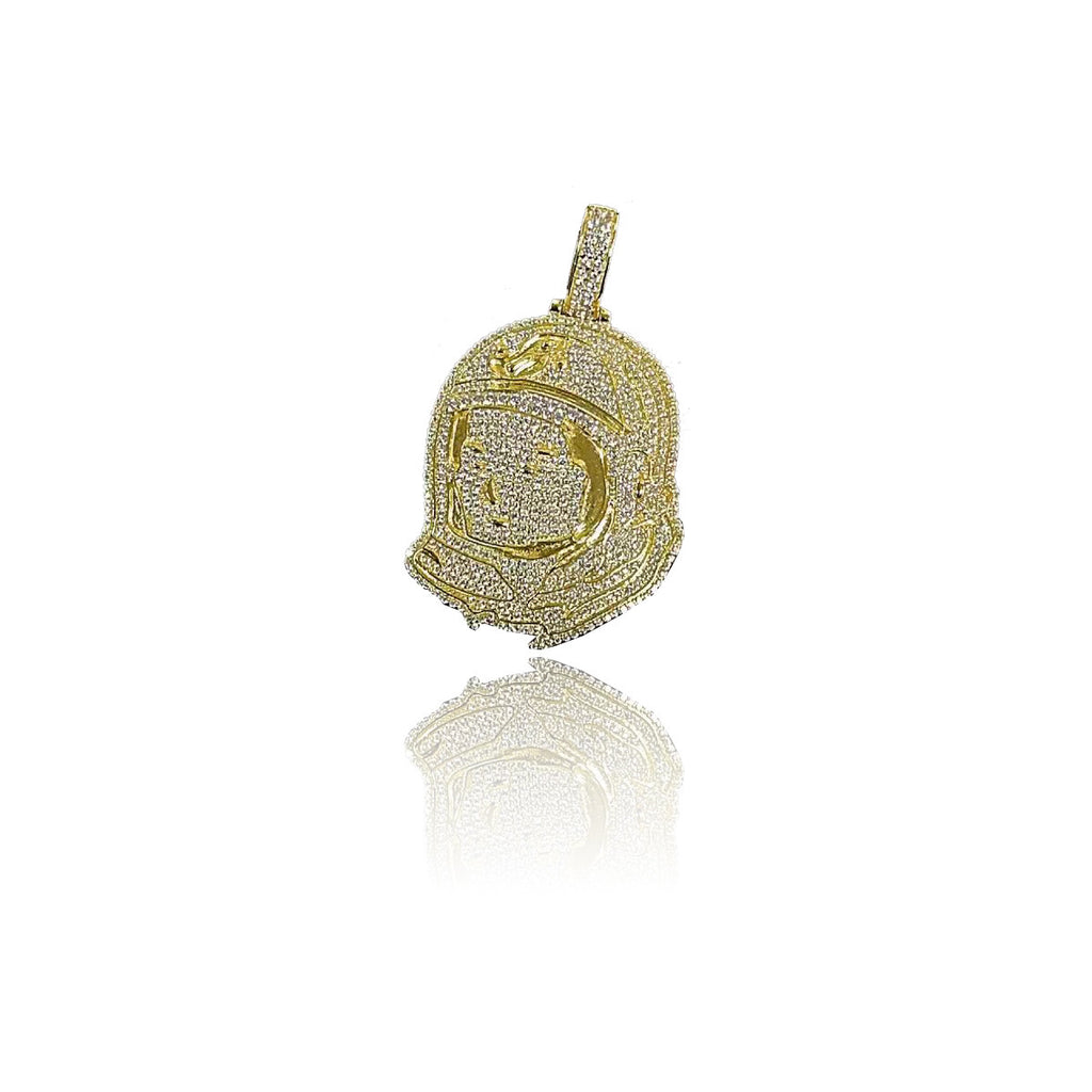 Inspired by skateboard P Pharrell Williams himself, founder of Billionaire Boys Club - the astronaut head pendant necklace chain in fully iced out. Micro pave setting with simulated diamonds, bale included. Approximately 28.8mm tall.