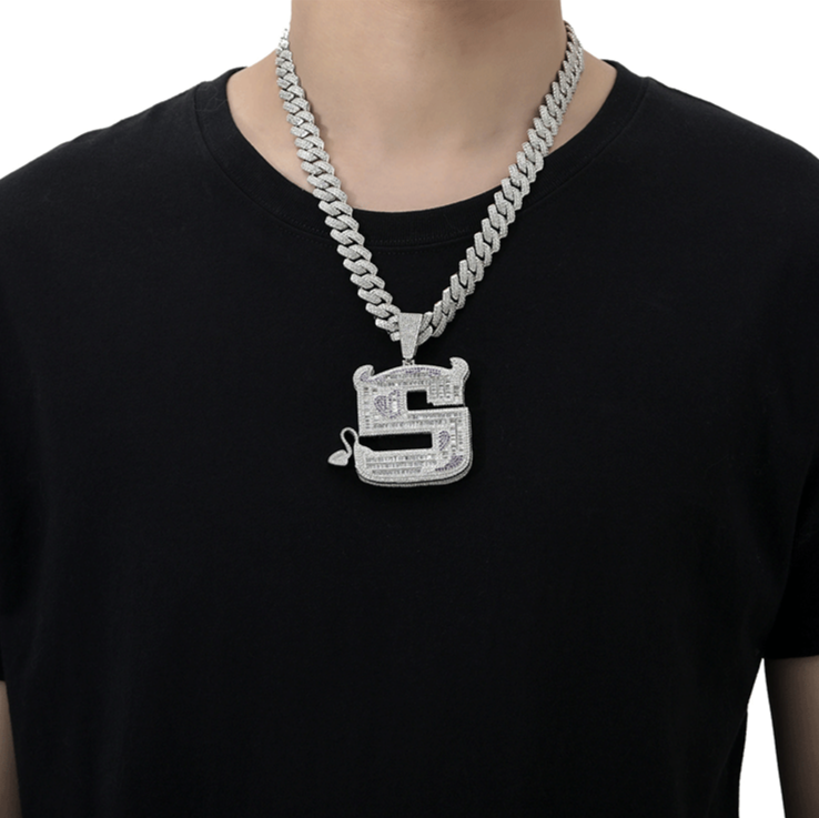 Iced Out Devilish letter S pendant necklace with free matching chain included.