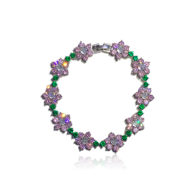 As seen on Frank instagram story Kandi man daisy flower Ocean's rave candy bracelet, fully iced with green emerald and pink stones. Prong set.