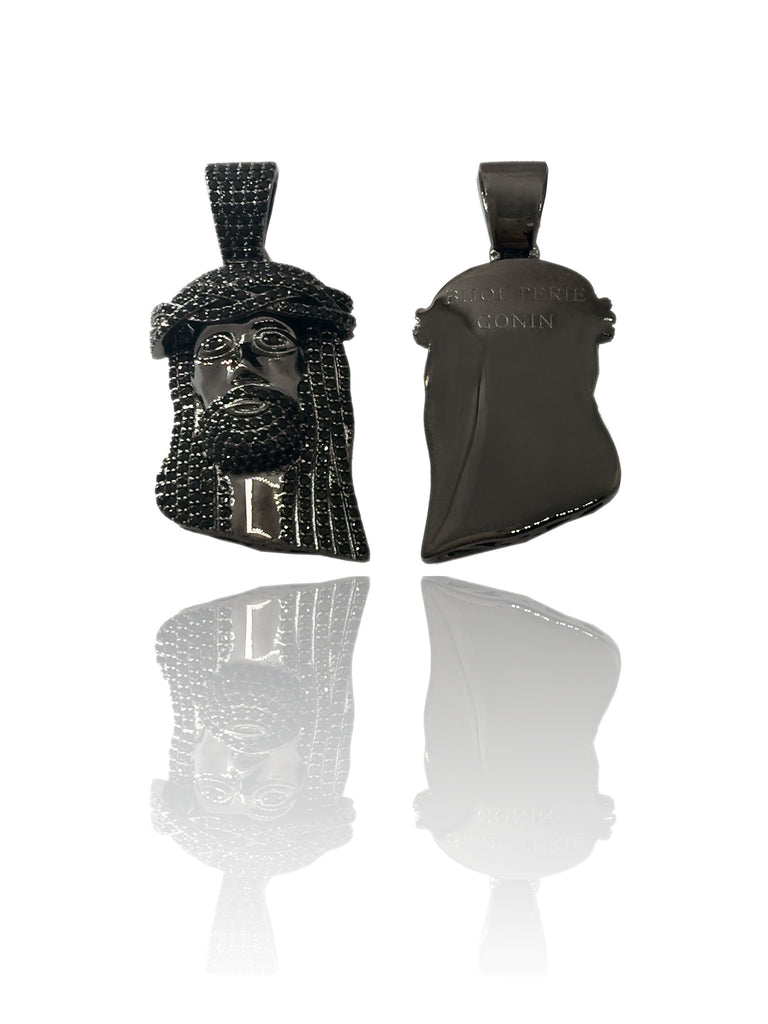 Our trademark Micro Jesus Piece, fully iced out! Once you own one, you'll discover why our Jesus Piece has been a classic joint desired by those all around the world for years. An original design by Bijouterie Gonin. With an artistic touch. Specially made in black gold, with black diamonds. Hand made as always. Hand detailed and hand set with round diamonds. A matching chain is included. Height approximately 29mm tall.