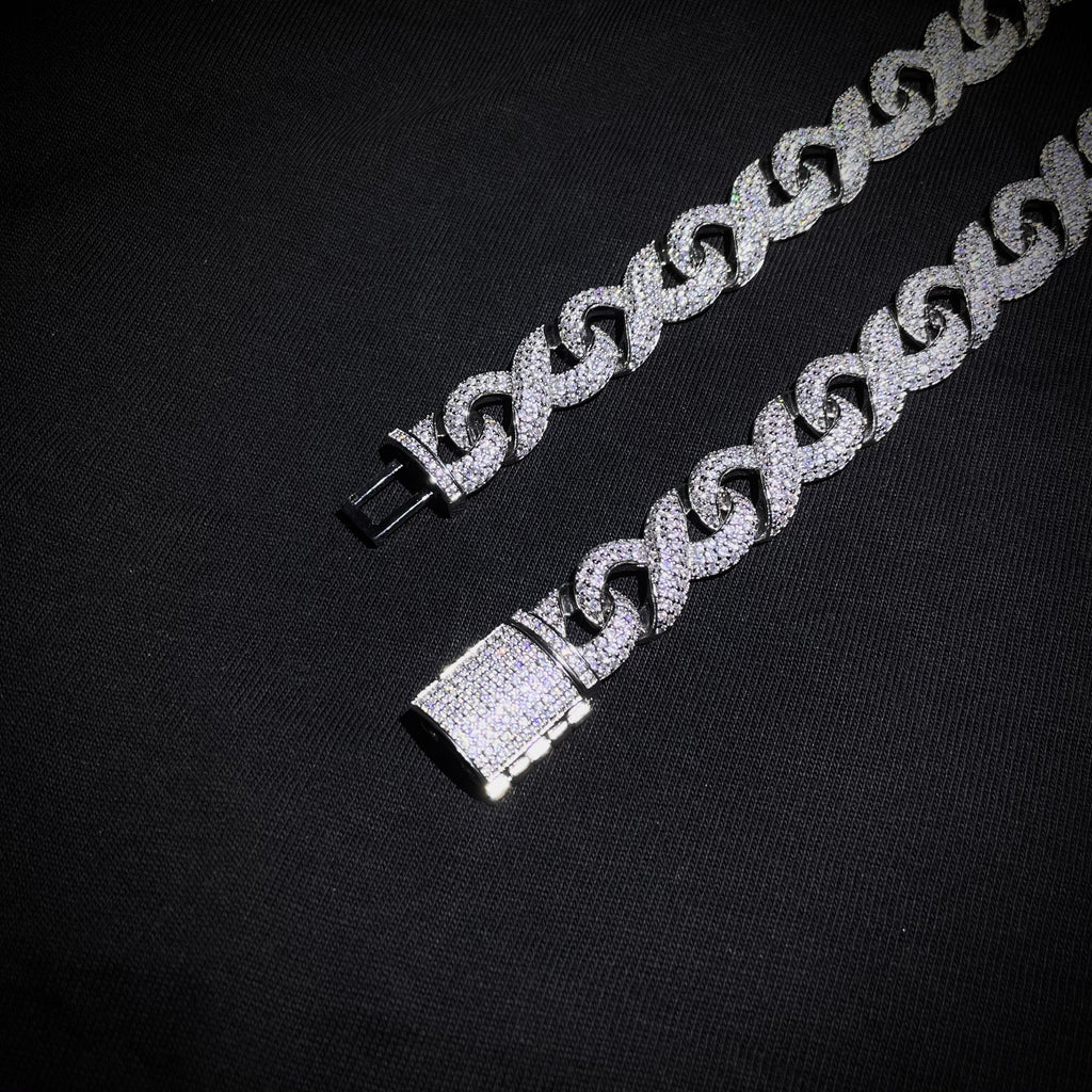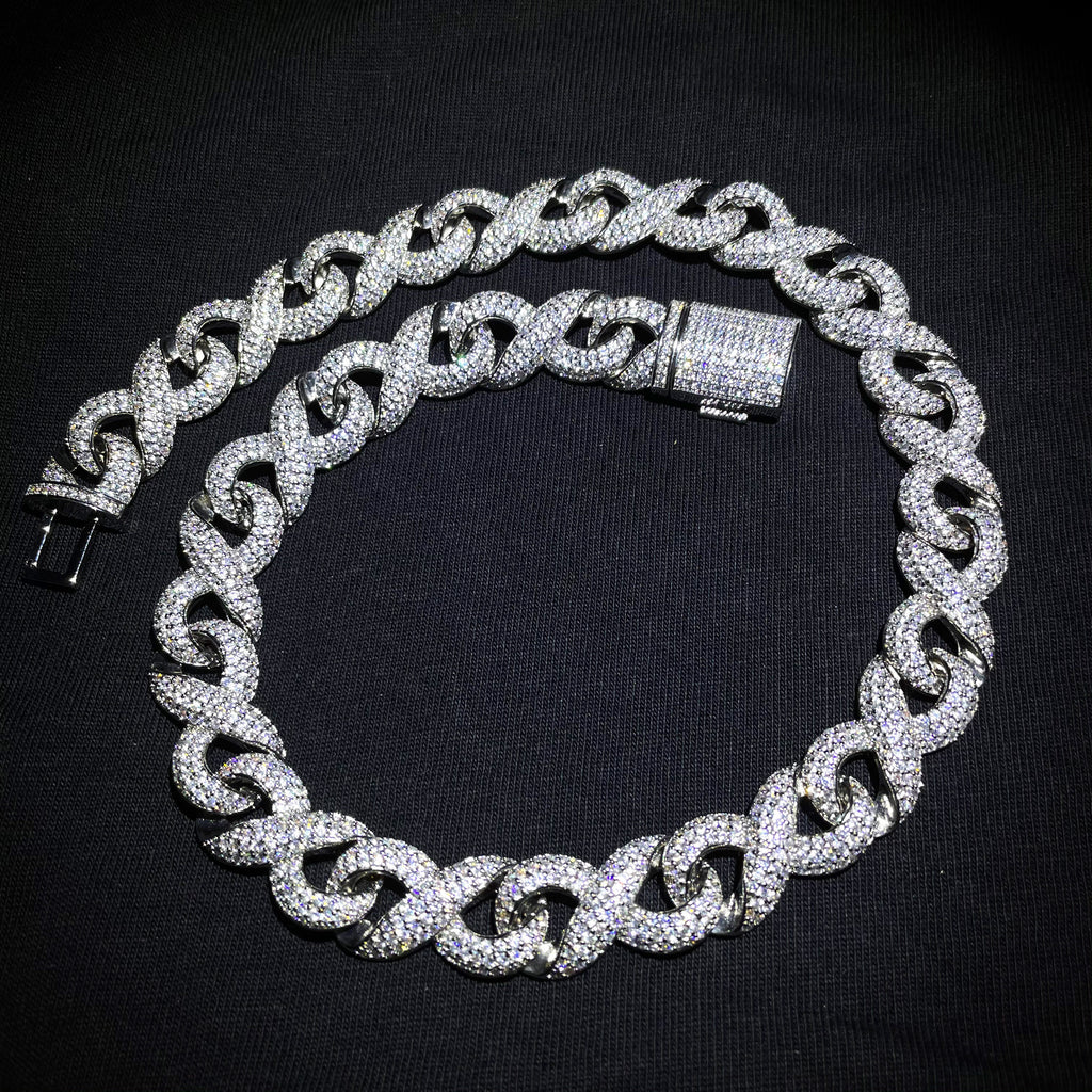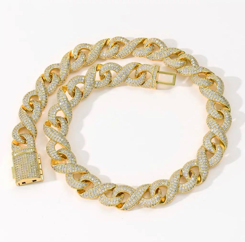 Fully iced Infinity cuban link interlaced necklace chain, micro pave set custom clasp.