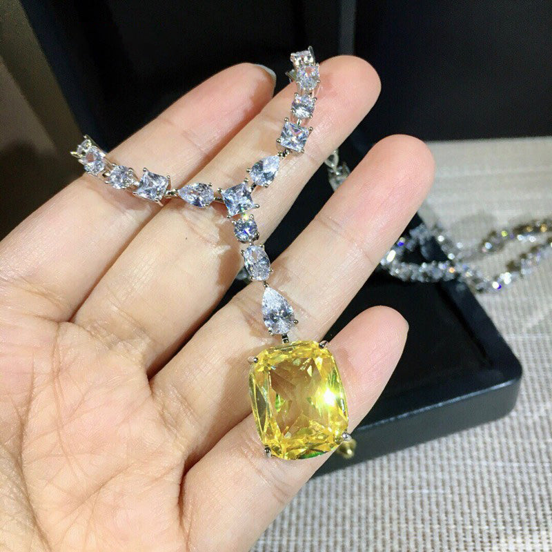 As seen on Lady Gaga, Audrey Heburn, Beyonce and more. Inspired by the famous Tiffany yellow diamond necklace. Featuring multi shaped gemstone teardrop, pear, round and square, radiant cut.