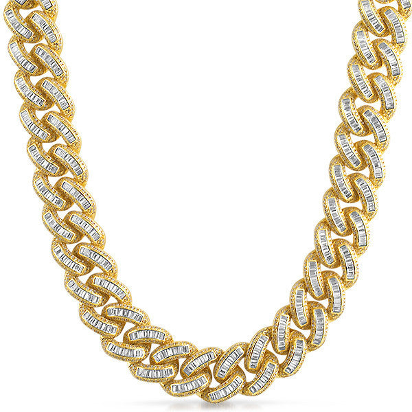 This is the most impressive iced cuban chain we have ever released. This stunning chain features 5000 baguette and round cut vvs flawless simulated diamonds precision set onto a thick, solid cuban chain. Only master jewelers are capable of this type of channel setting with over 15 man hours per chain.