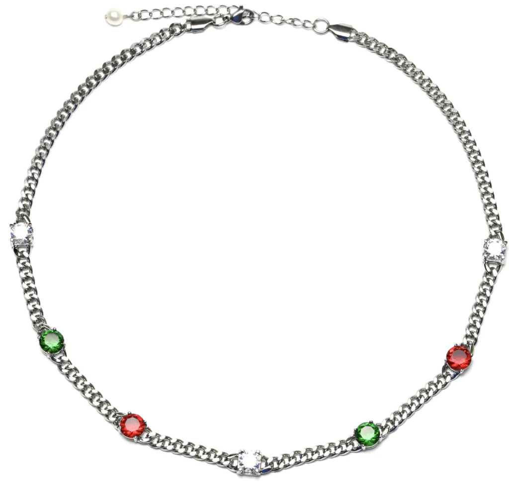 Multicolored gemstone includes ruby, green emerald and white round stone