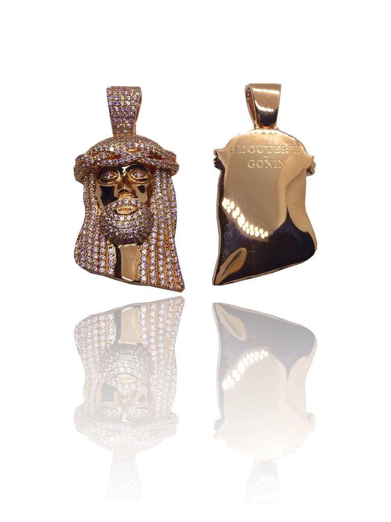 Our trademark Micro Jesus Piece, fully iced out! Once you own one, you'll discover why our Jesus Piece has been a classic joint desired by those all around the world for years. An original design by Bijouterie Gonin. With an artistic touch. Specially made in rose gold, with white diamonds. Hand made as always. Hand detailed and hand set with round diamonds. A matching chain is included. Height approximately 29mm tall.