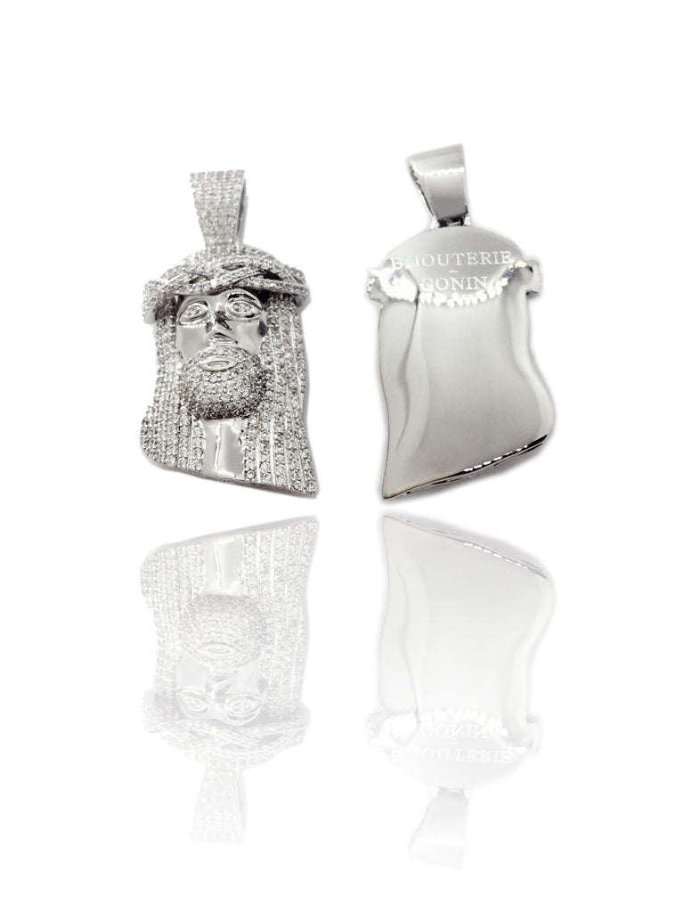 Our trademark Micro Jesus Piece, fully iced out! Once you own one, you'll discover why our Jesus Piece has been a classic joint desired by those all around the world for years. An original design by Bijouterie Gonin. With an artistic touch. Specially made in silver, with white diamonds. Hand made as always. Hand detailed and hand set with round diamonds. A matching chain is included. Height approximately 29mm tall.