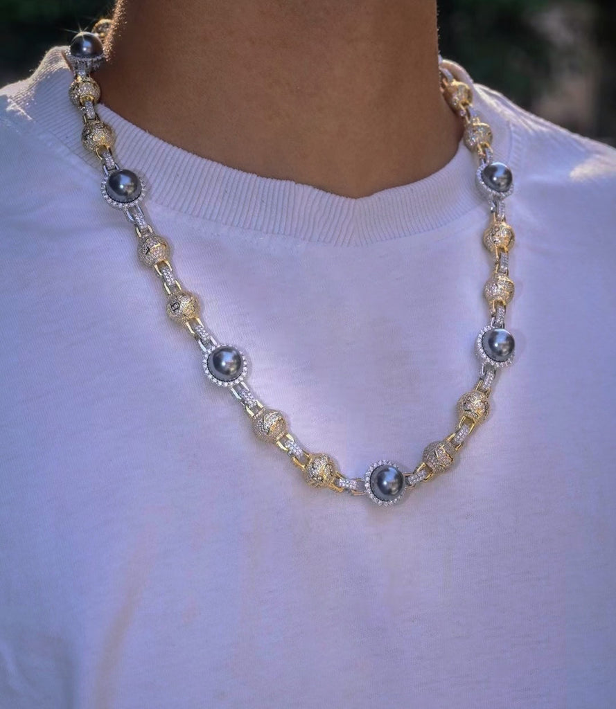 Travis recently got pretty generous with his team, gifting his inner circle iced-out Takashi Murakami-designed chains. The pendant top with this beaded freshwater pearl necklace chain. Each pearl is laced by one row of fully iced out set, along with the fully iced ball approx at 8mm wide.