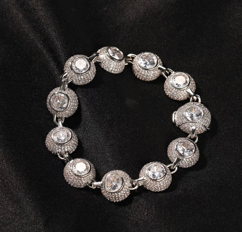 Each link featuring a round larger stone and is micro pave set with AAA round white stones, dipped and coated with WHITE GOLD. Each links is featuring one round white stone.