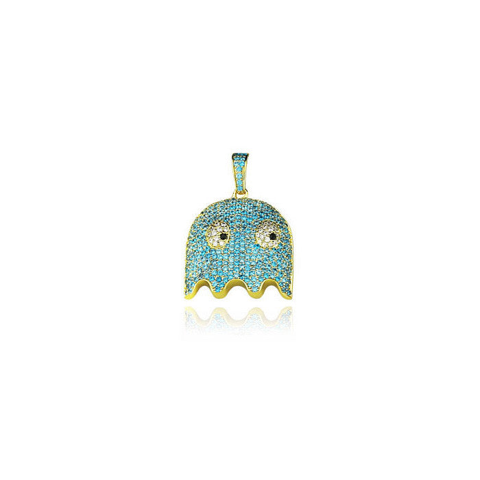 Ghosts pendant, primarily Blinky, Pinky, Inky and Clyde, are the monsters chasing. We make them alive by crafting the piece, approximately 24.7mm tall, micro pave setting in multicolored simulated diamonds. double layer plated work to ensure long wearing.