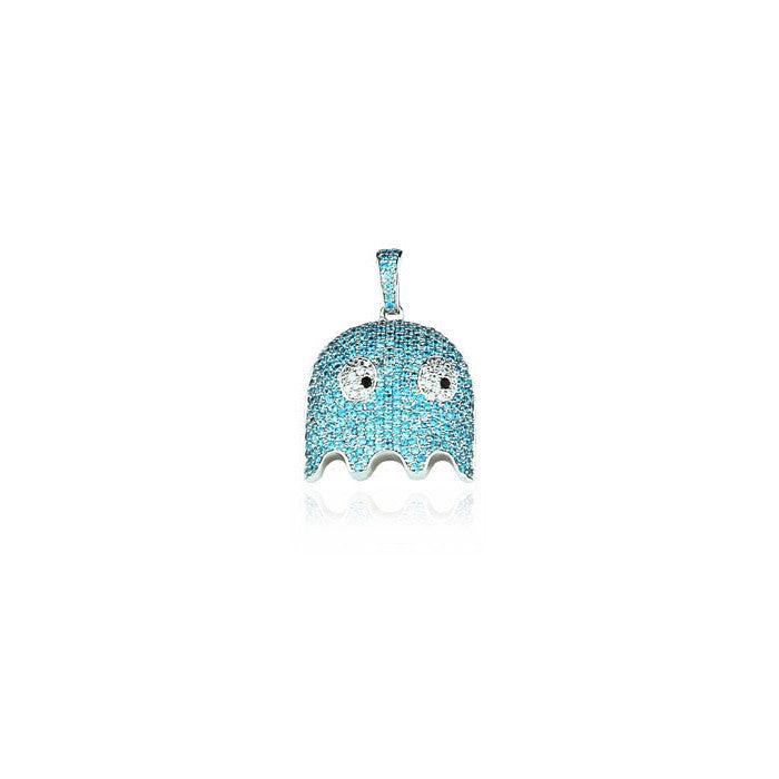 Ghosts pendant, primarily Blinky, Pinky, Inky and Clyde, are the monsters chasing. We make them alive by crafting the piece, approximately 24.7mm tall, micro pave setting in multicolored simulated diamonds. double layer plated work to ensure long wearing.