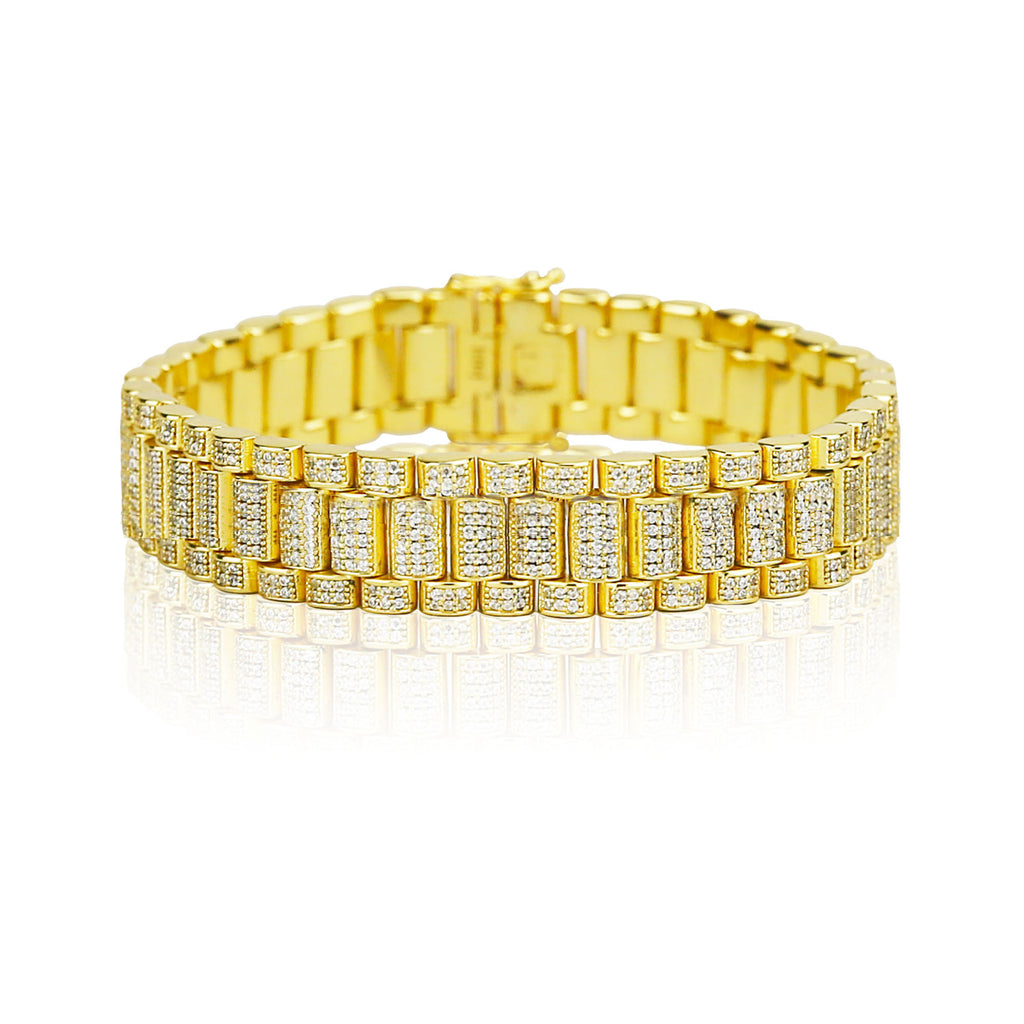 This high quality 925 silver made bracelet features the exact same styling as the Rolex presidential. It is the same size, finishing and thickness. Matches up to a solid gold Rolex perfectly. This bracelet has polished mid-links and edges. This bracelet is made out of 925 silver and features 18K Gold IP plating which is thick and durable. Giving you a top layer of genuine gold. Micro pave set vvs simulated diamonds. It is 15.3 mm wide. Comes in length from 7-10 inches.