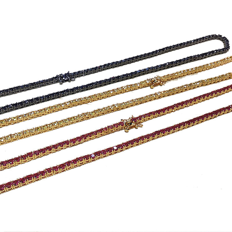 Our top selling tennis chains are now available in 4mm small stone size. This smaller stone size gives a more believable look than the larger stone versions. They look best with multiple chains layered together. Choker style from 20" to regular 30". Custom clasp from BG. Order yours today.