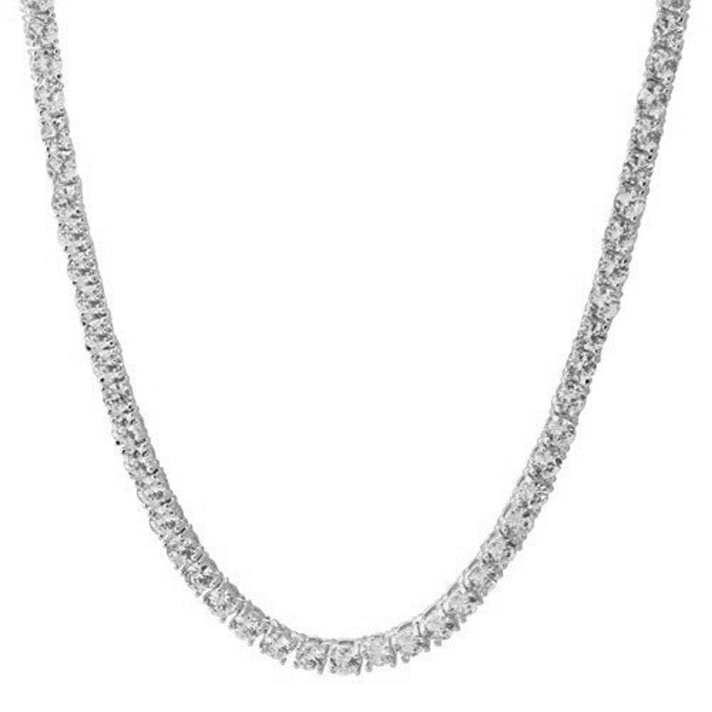 Our top selling tennis chains are now available in 4mm small stone size. This smaller stone size gives a more believable look than the larger stone versions. They look best with multiple chains layered together. Choker style from 20" to regular 30". Custom clasp from BG. Order yours today.
