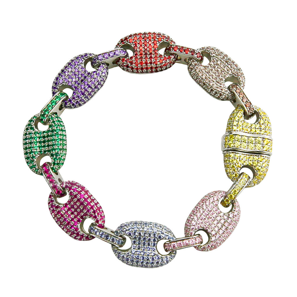 This insane 18mm Gucci link bracelet in multi-colored is just like what you see on rappers except this version is made with lab created simulated diamonds. Inspired by Pharrell Williams and Nigo. The sparkle and shine is incredible on this jumbo piece. Get spotted from a block away with this amazing chain. Order yours today.