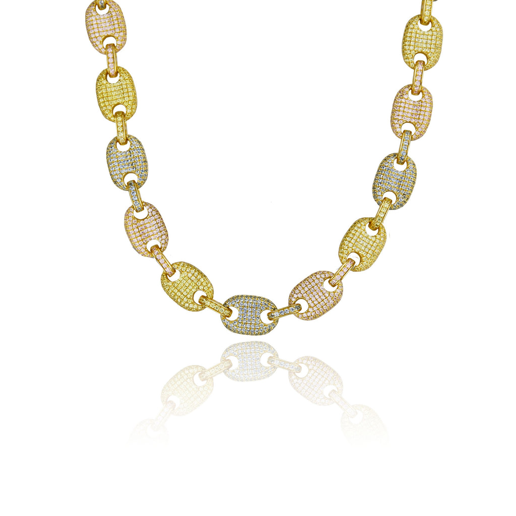 This insane 13mm Gucci link bracelet in multi-colored is just like what you see on rappers except this version is made with lab created simulated diamonds. Inspired by Pharrell Williams and Nigo. The sparkle and shine is incredible on this jumbo piece. Get spotted from a block away with this amazing chain. Order yours today.