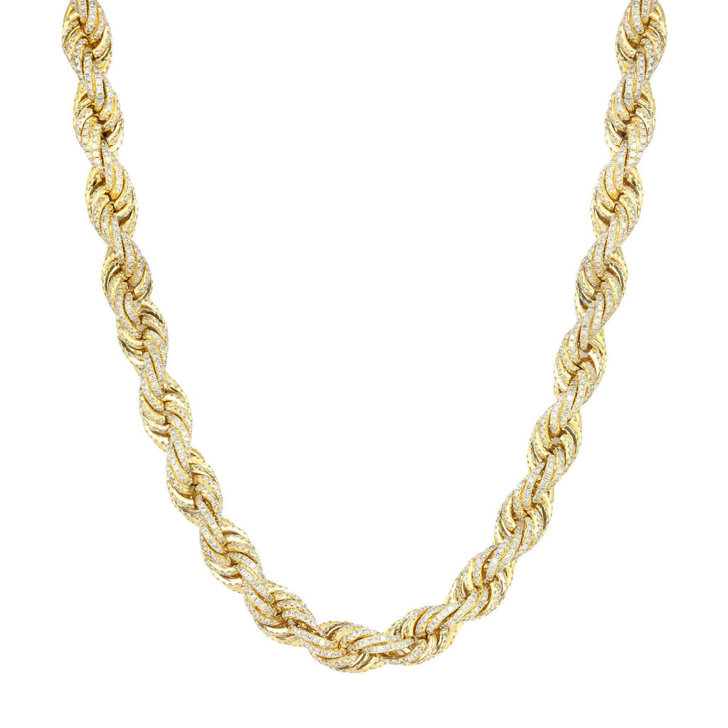 Iced out rope Chain with a high-end 18K yellow gold Finish. This stunning chain features over 3000 round cut cz stones set onto a solid rope chain. Only master jewelers are capable of this type of channel setting with over 15 man hours per chain / bracelet . This rope chain has a width of 11mm which makes it perfect for those that want a Medium sized Chain. This item also comes in Silver, White Gold, Platinum & and in different widths. No other chain is as hot as the rope link right now, and no other chain can make a statement the way these chains do.