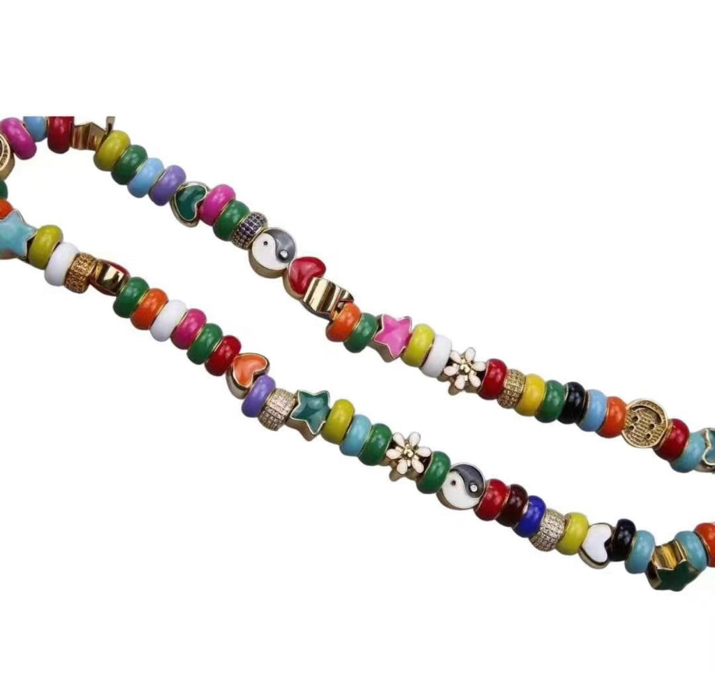 Smiley face, stars, a flower, yin-yang symbol, heart, and cross, in addition to beads made of aaa round stones, silver and ceramic enamel finish.